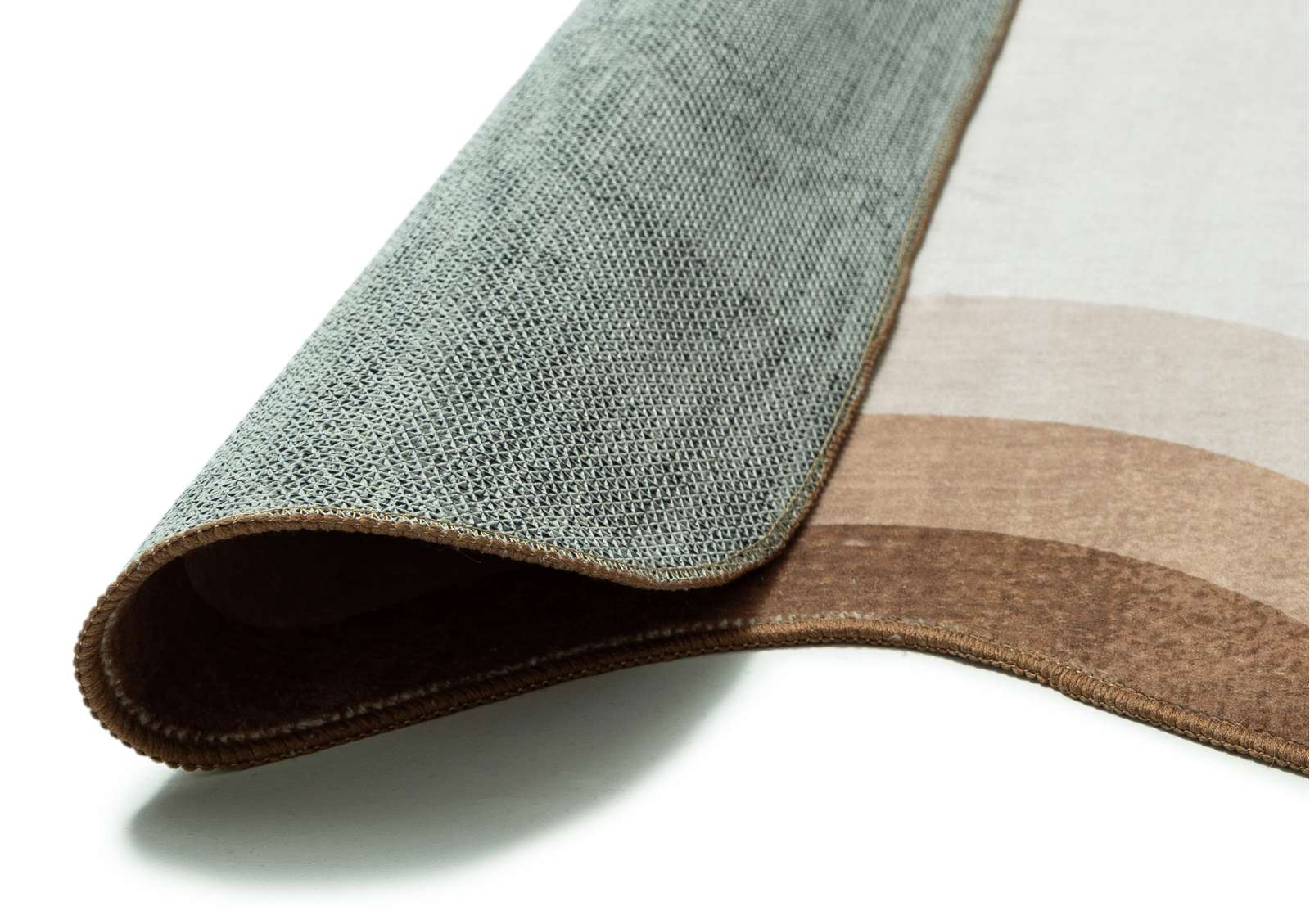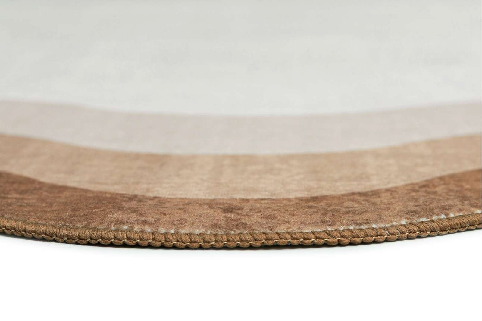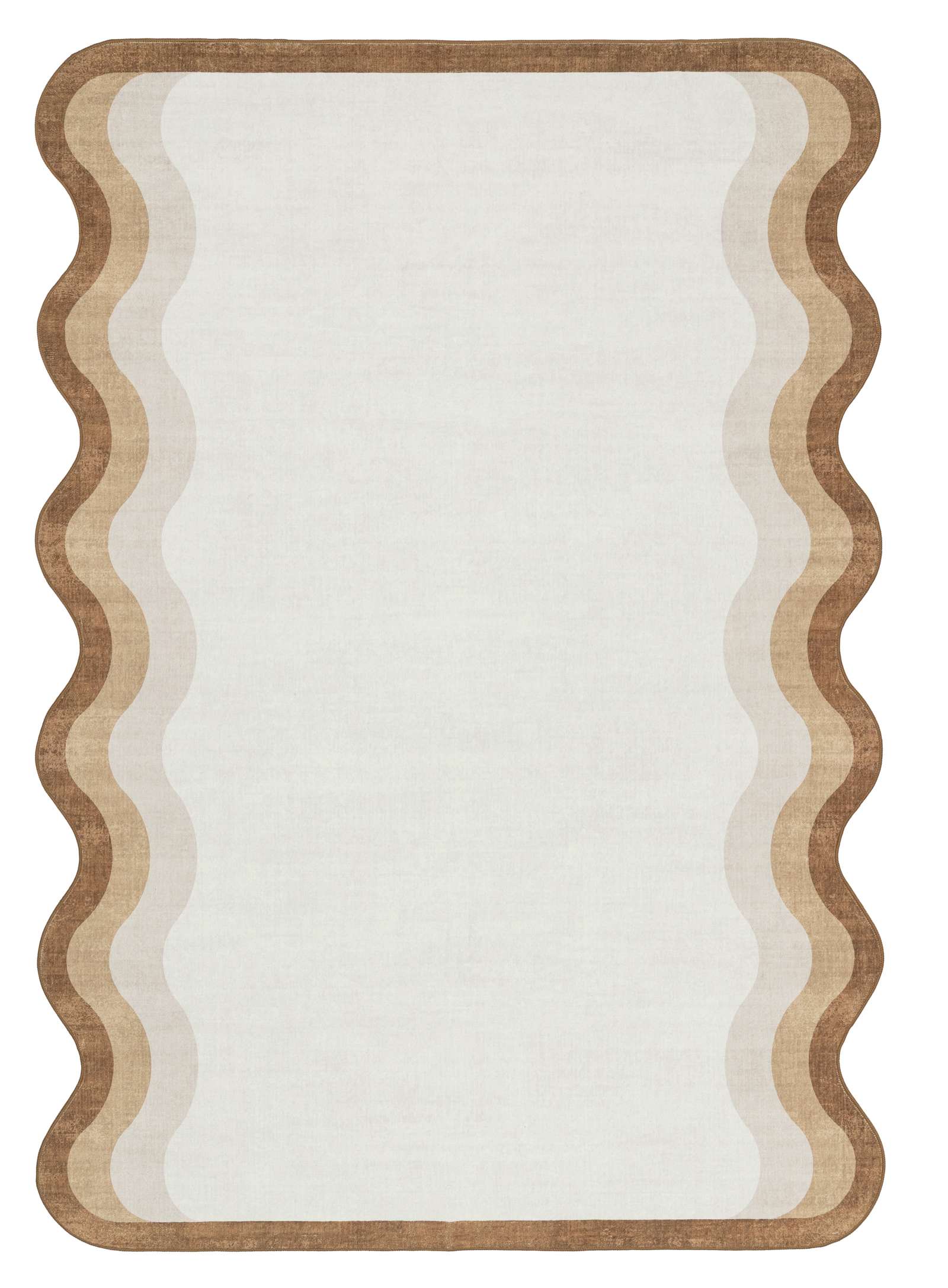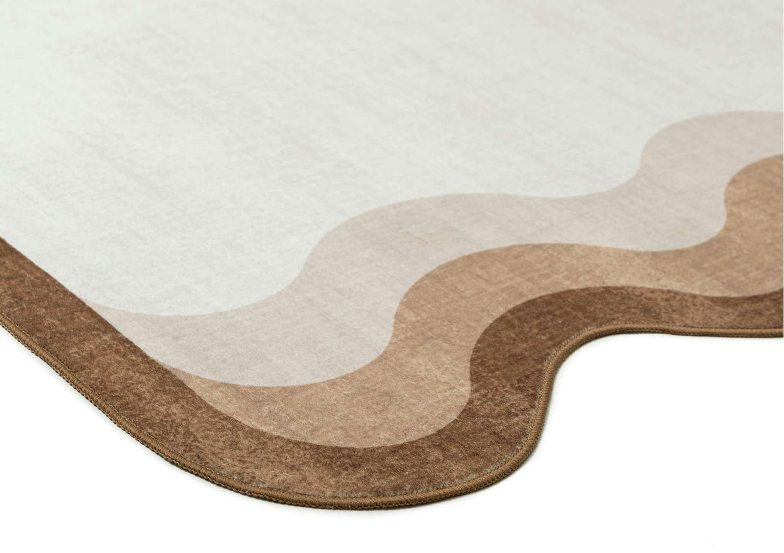 Matera is a smooth machine washable foldable flatweave rug featuring a sculptural scalloped border in layered tonal browns over a soft cream base.