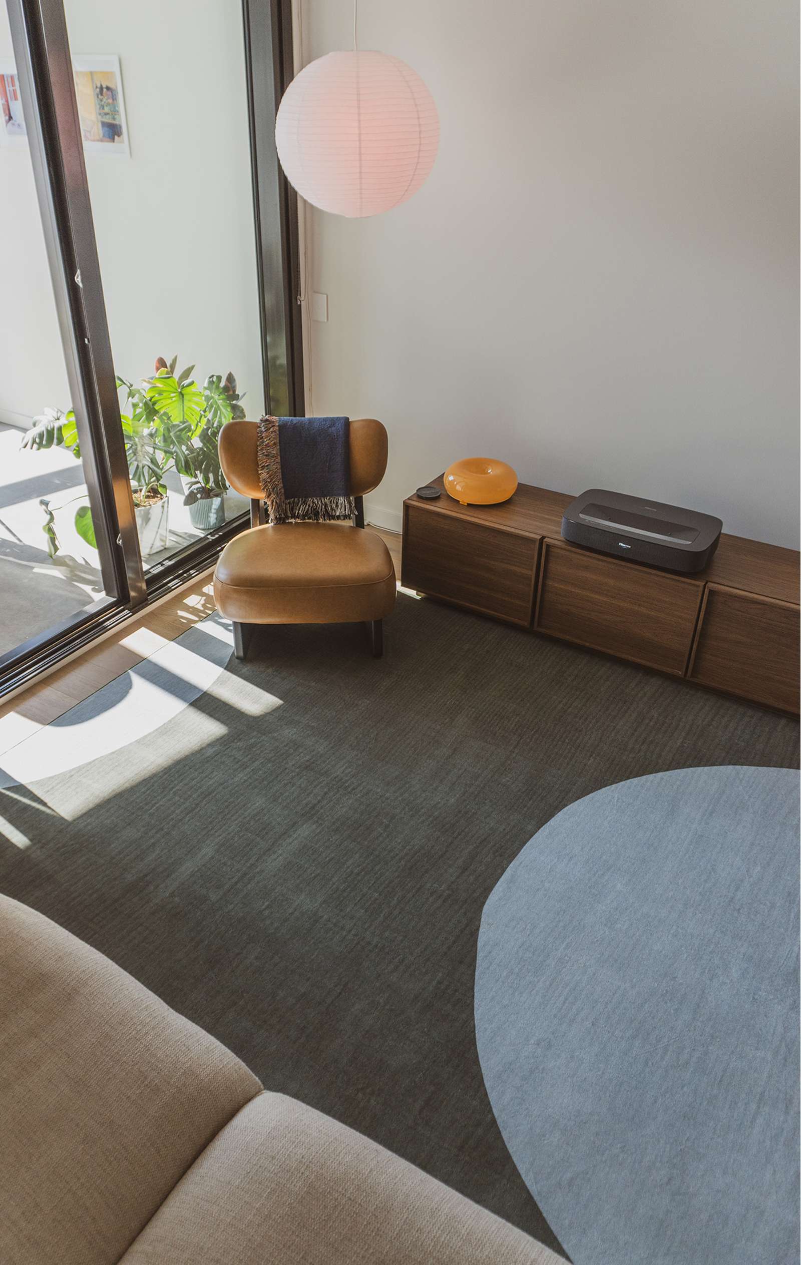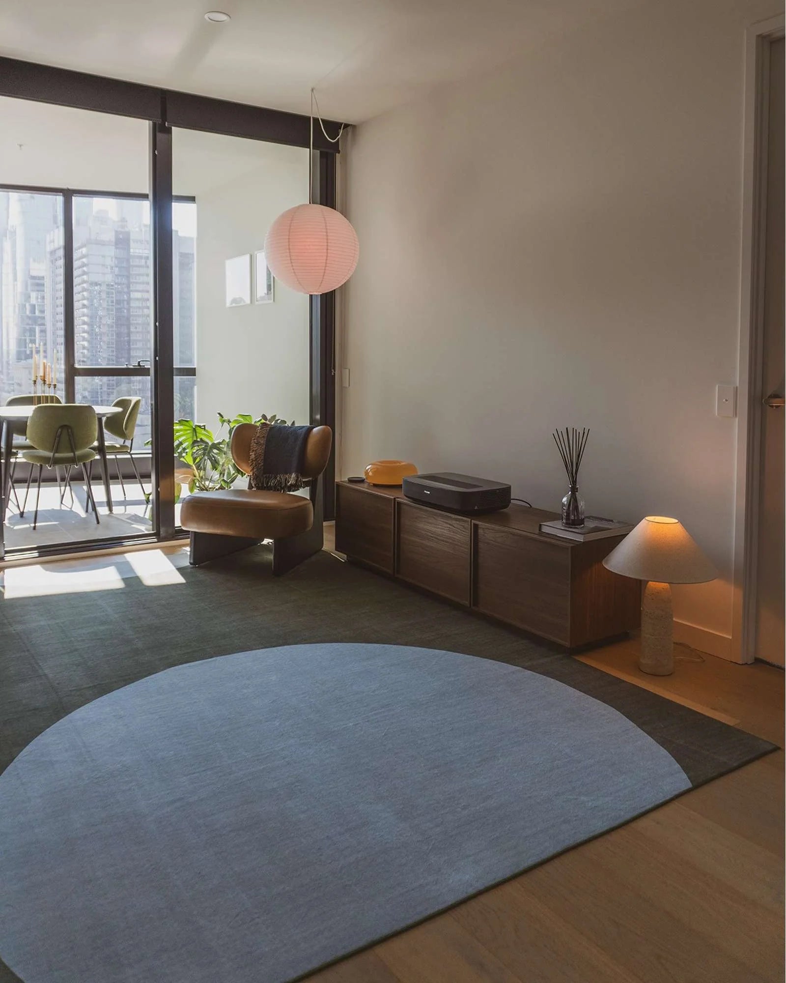 Marcado is a smooth machine-washable foldable flatweave rug with a deep forest green and baby blue colour and a curvy circle pattern that we have lovingly coined moons.