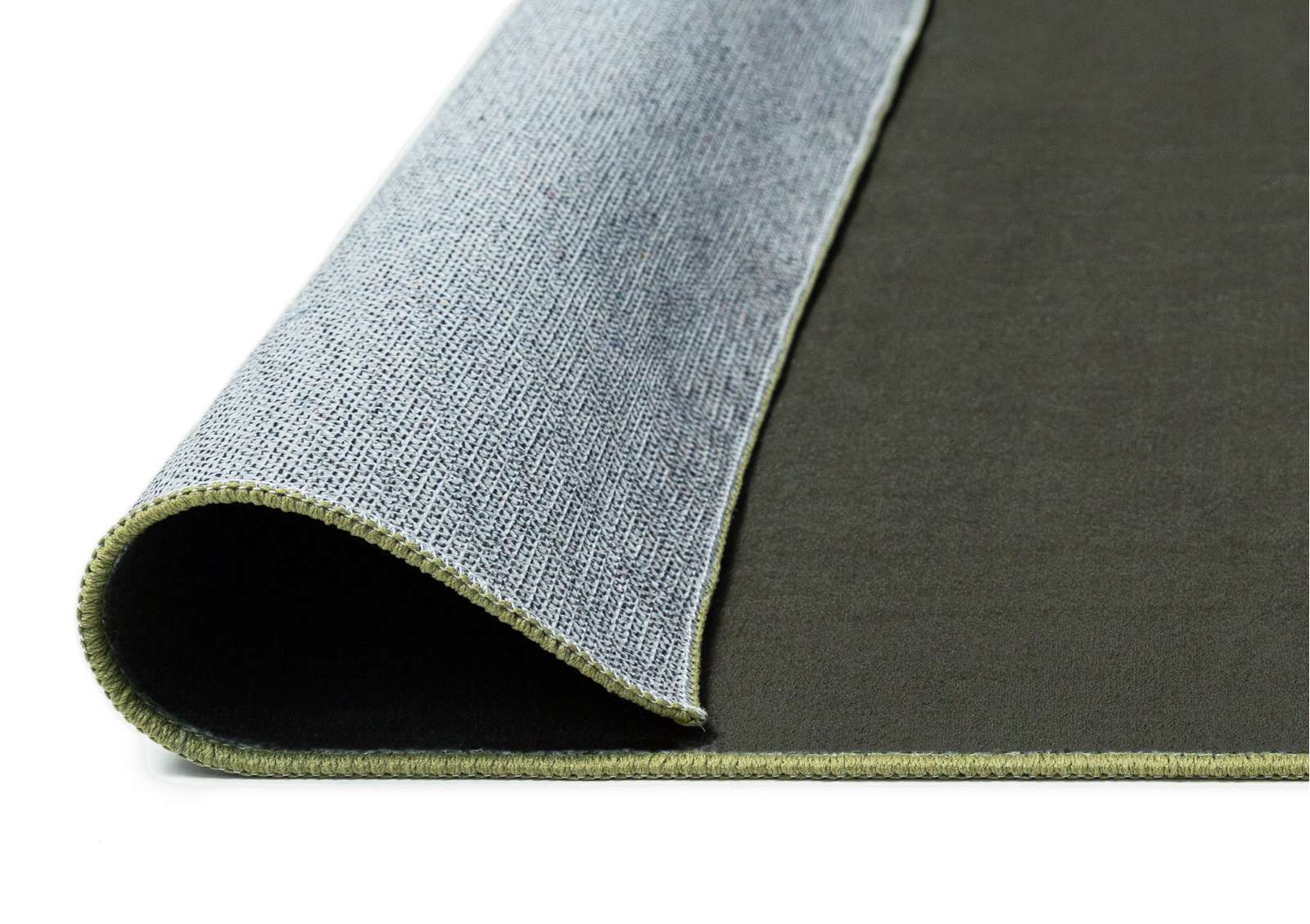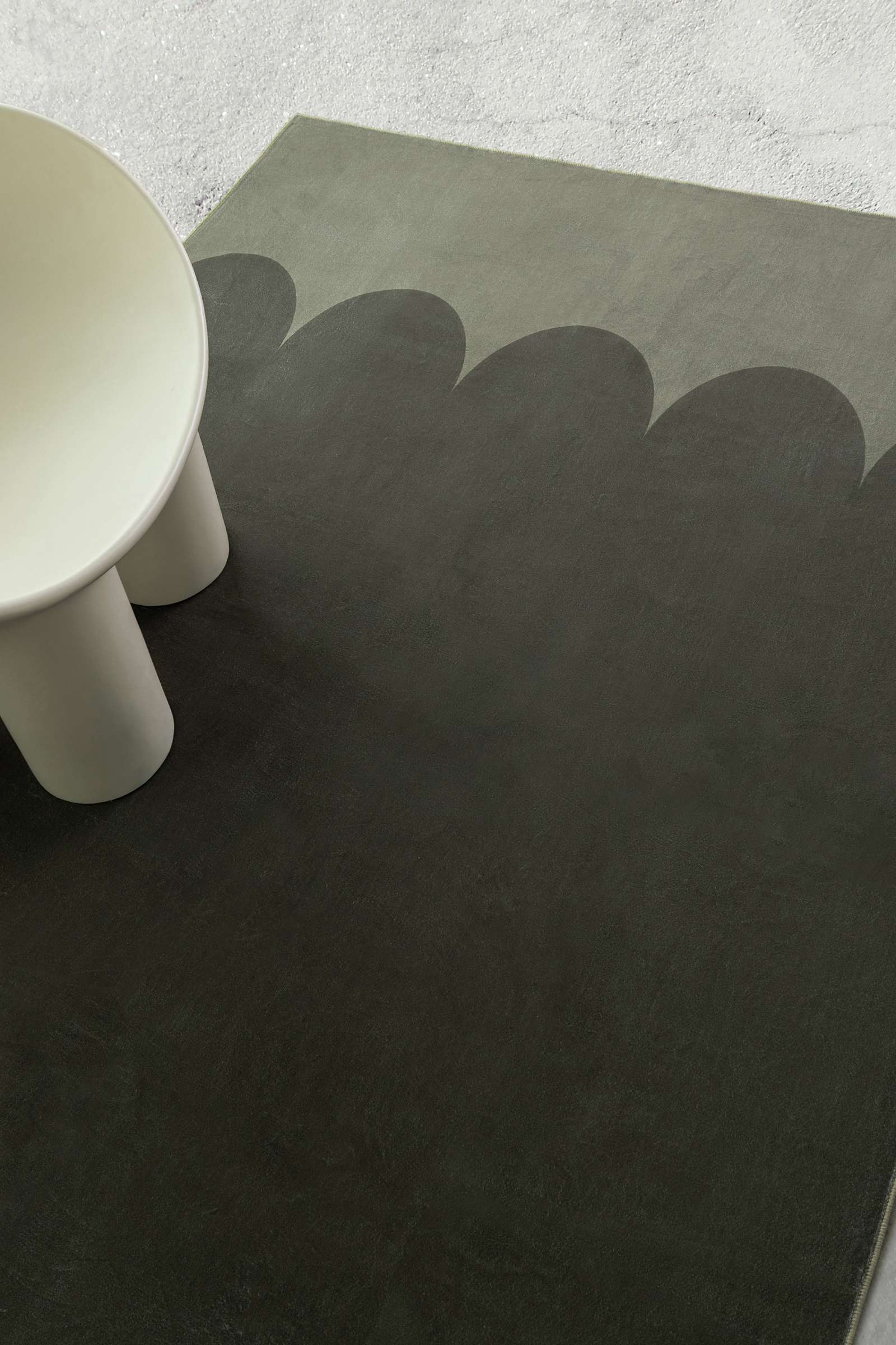 Inuya is a smooth machine washable foldable flatweave rug in two tones of dark green, with a curvy pattern.