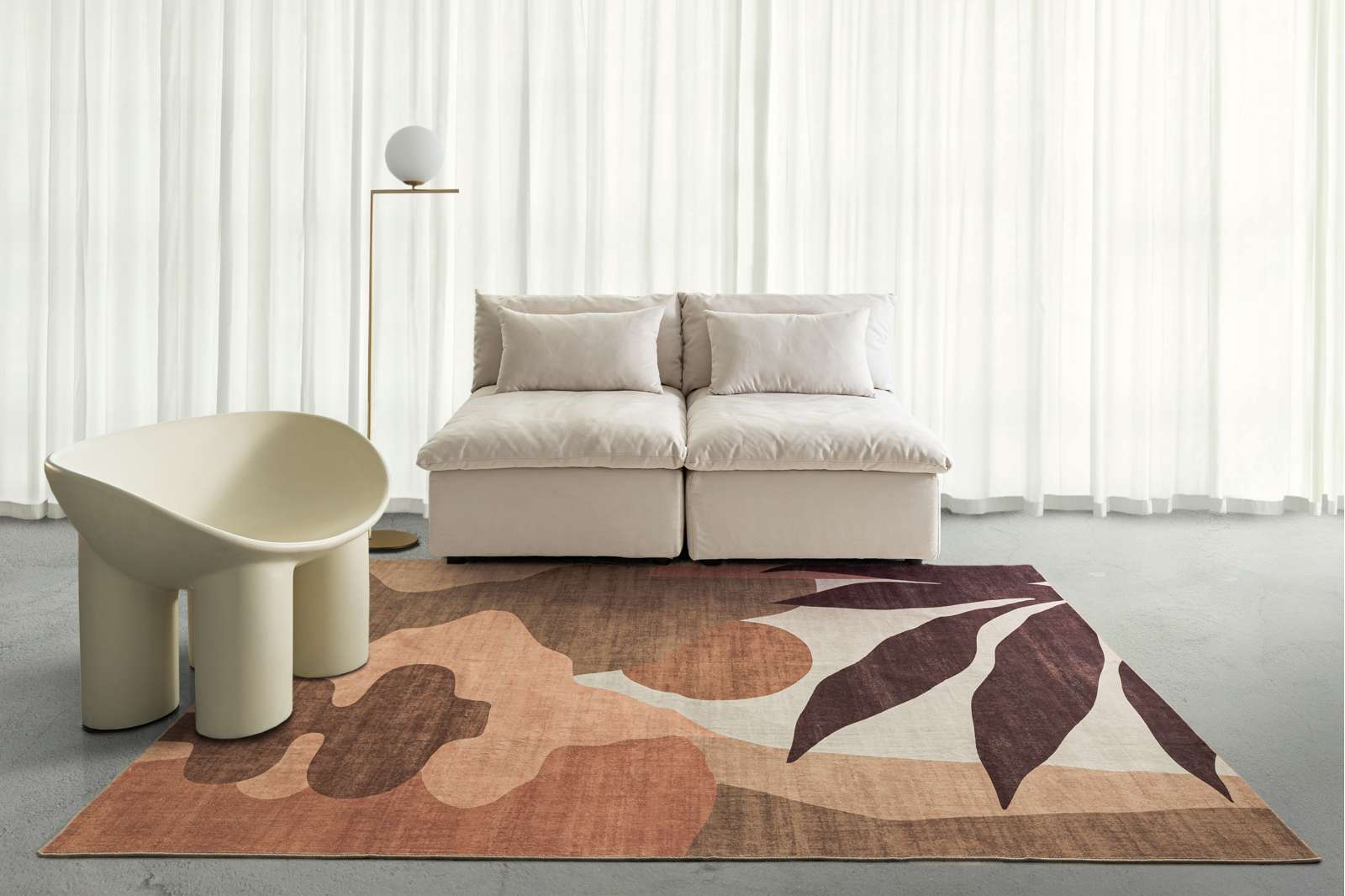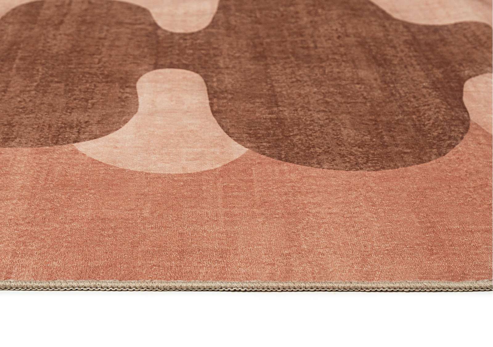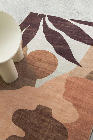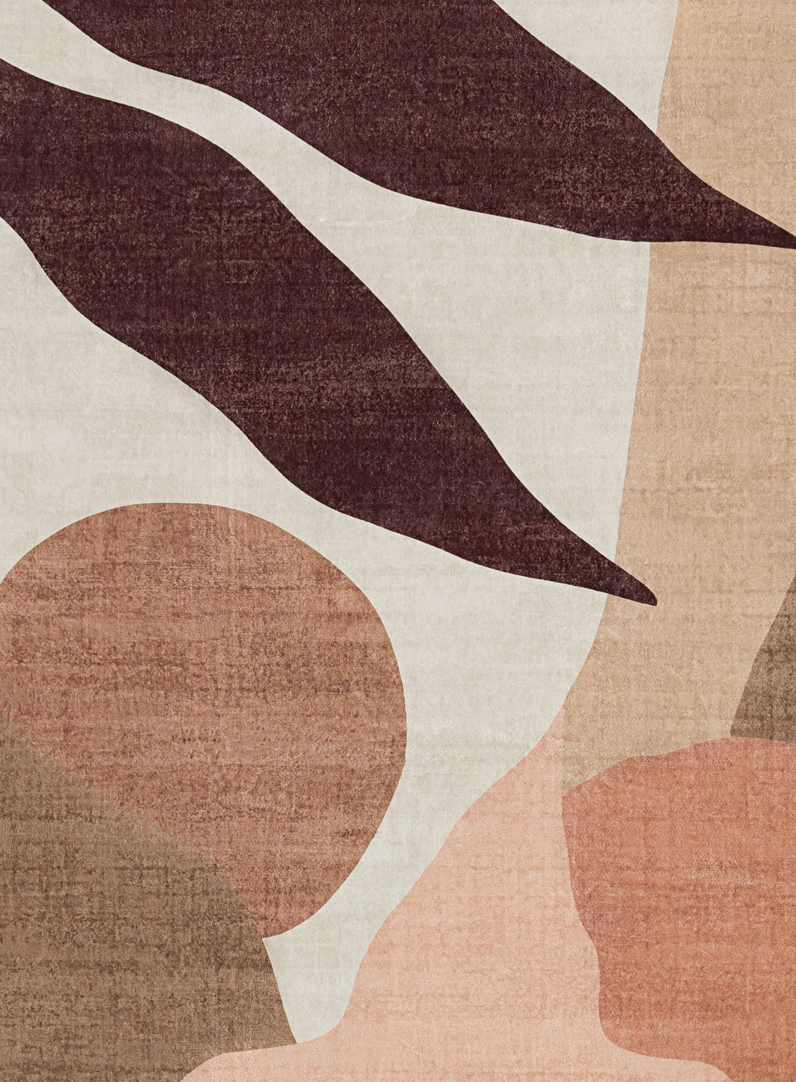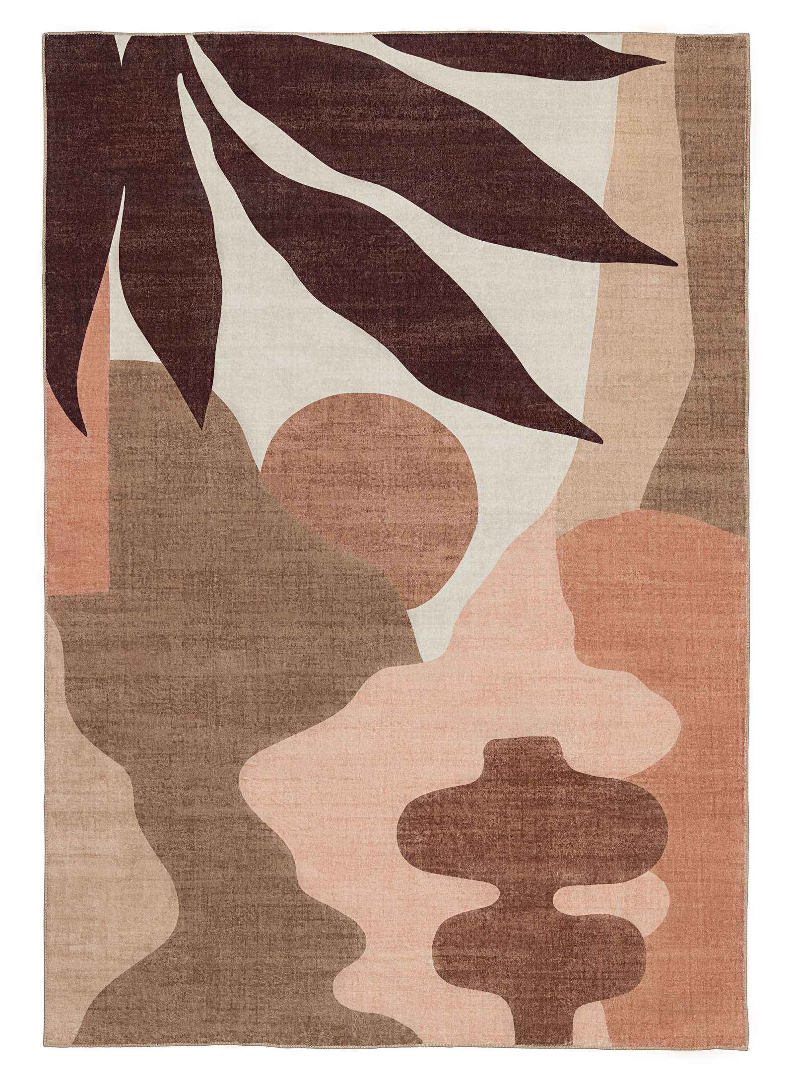 Preta is a smooth machine washable foldable flatweave rug with a distressed burgundy, brown, and beige organic natural pattern inspired by palms.