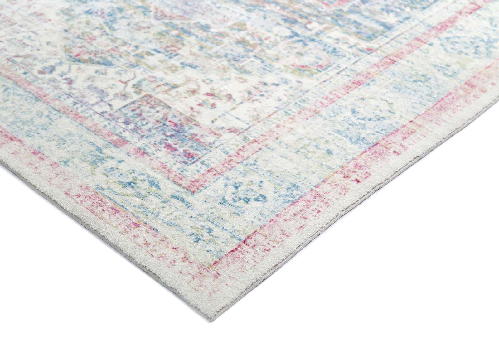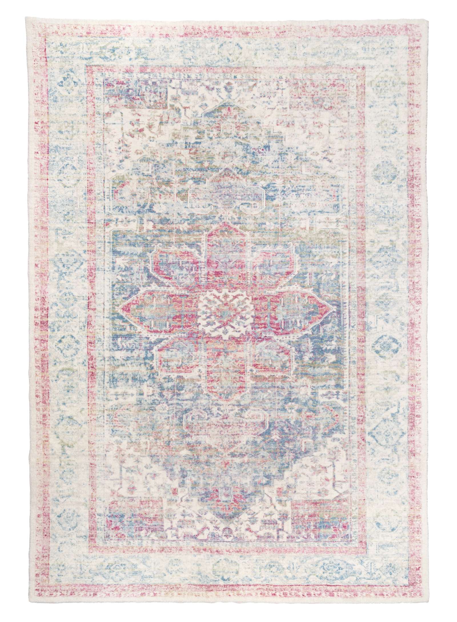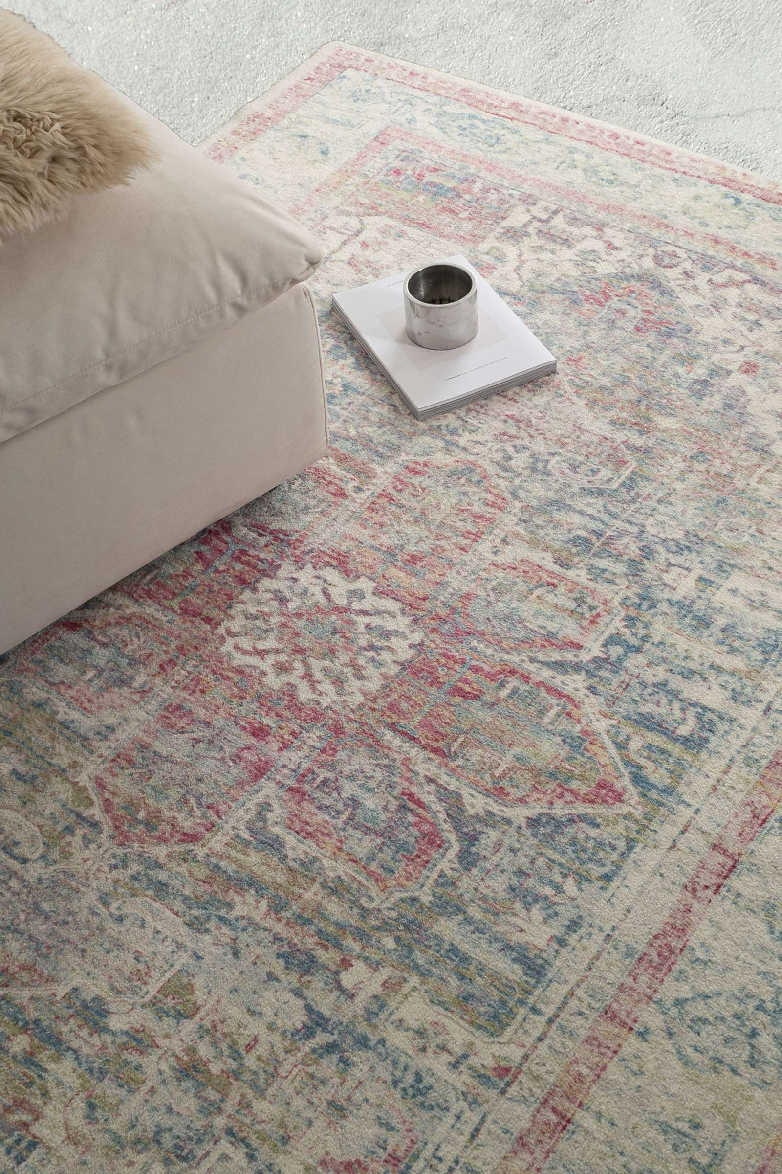 Introducing the Seri Medallion Washable Rug, a modern twist on a classic vintage design. This rug features a traditional distressed floral pattern in blue, pink, and green on a faded ivory-based bordered background, making it a unique addition to any space and decor.