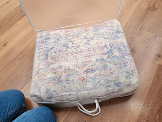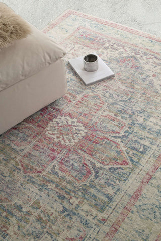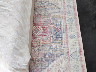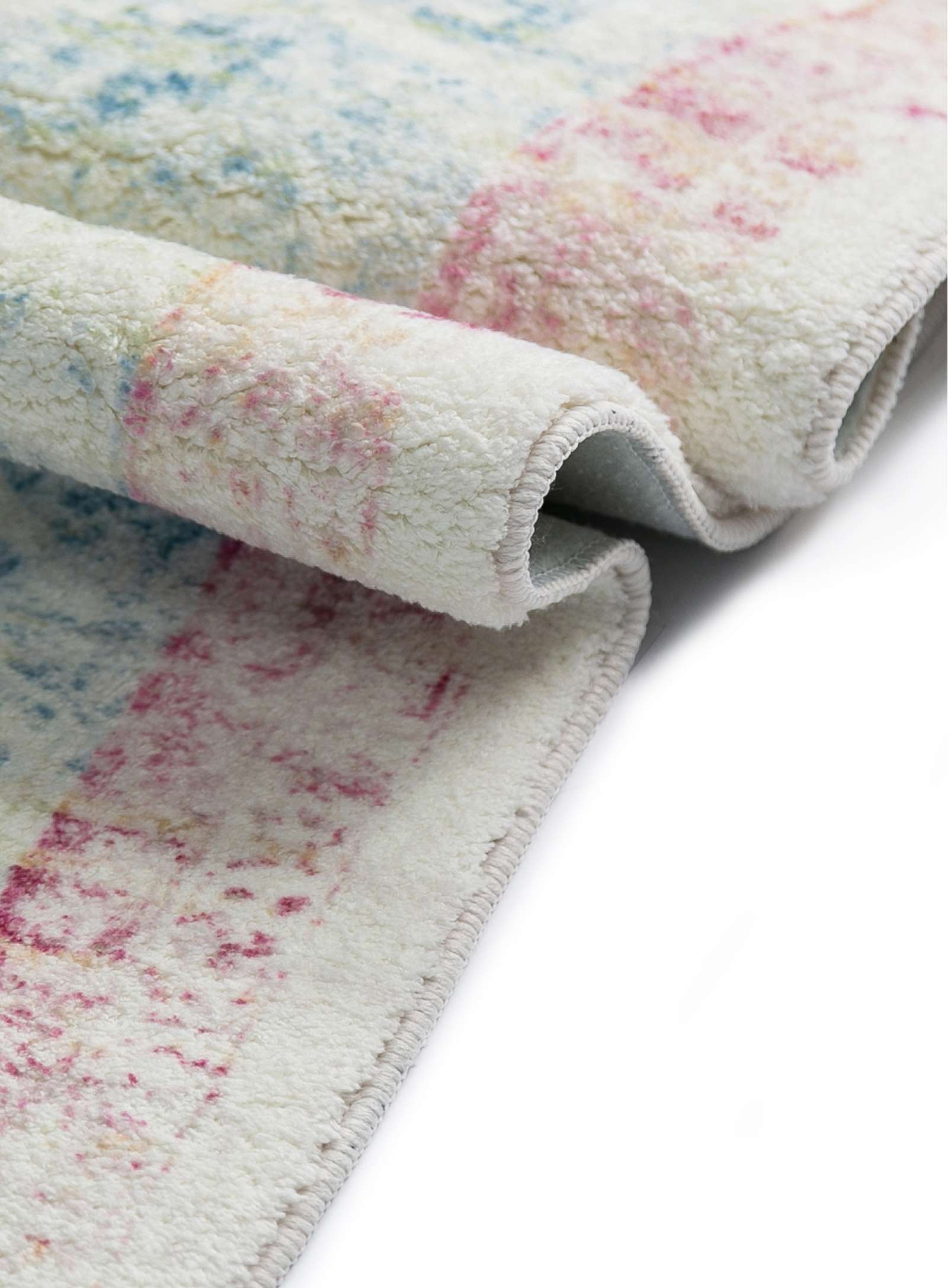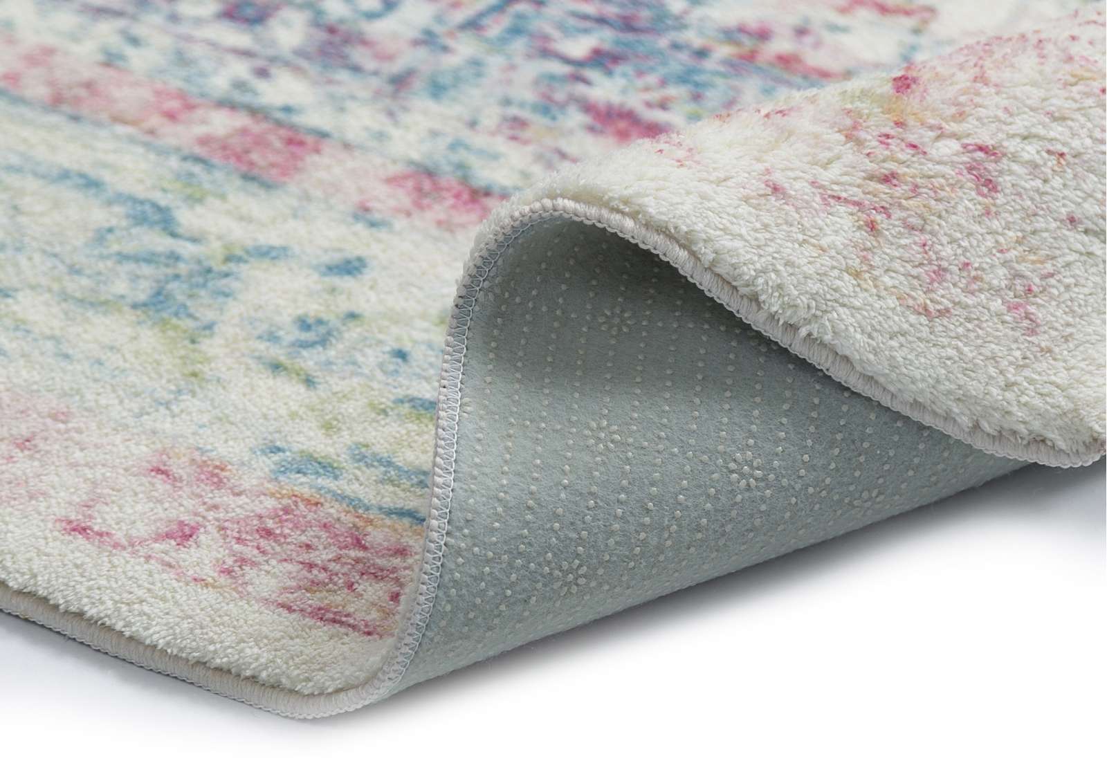 Introducing the Seri Medallion Washable Rug, a modern twist on a classic vintage design. This rug features a traditional distressed floral pattern in blue, pink, and green on a faded ivory-based bordered background, making it a unique addition to any space and decor.